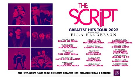 The celebrations will extend deep into 2022 with the confirmation of a huge uk and european greatest hits tour stopping at utilita arena birmingham in june! The script and ella henderson. The group will be touring in celebration of their tales from the script album, a compilation of their biggest hits and fan favourites from their six studio albums so.